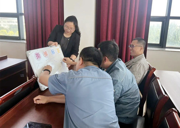 在兩場培訓(xùn)中,王玉娥老師以馬斯洛和威廉·詹姆斯的箴言開篇,深刻闡釋“心態(tài)改變命運(yùn)”的主題。課程精準(zhǔn)聚焦企業(yè)需求,針對建設(shè)集團(tuán)高風(fēng)險作業(yè)特性,王老師運(yùn)用“九人過橋”實(shí)驗(yàn)揭示恐懼對判斷的制約,并通過情景模擬與特色撕紙游戲,直觀展現(xiàn)單向溝通的隱患,由此推動建立“指令復(fù)述-確認(rèn)”的雙向溝通機(jī)制;面對陽光能源精細(xì)化生產(chǎn)要求,王老師以“野田圣子”從抗拒刷馬桶到成為日本郵政大臣的案例,生動詮釋“積極心態(tài)”化平凡為非凡的力量,并創(chuàng)新性地將質(zhì)量管控融入冥想訓(xùn)練,引導(dǎo)職工在呼吸調(diào)節(jié)中模擬“精密零件檢測”的專注狀態(tài),深刻體悟心緒平穩(wěn)與追求產(chǎn)品零缺陷的內(nèi)在關(guān)聯(lián)。